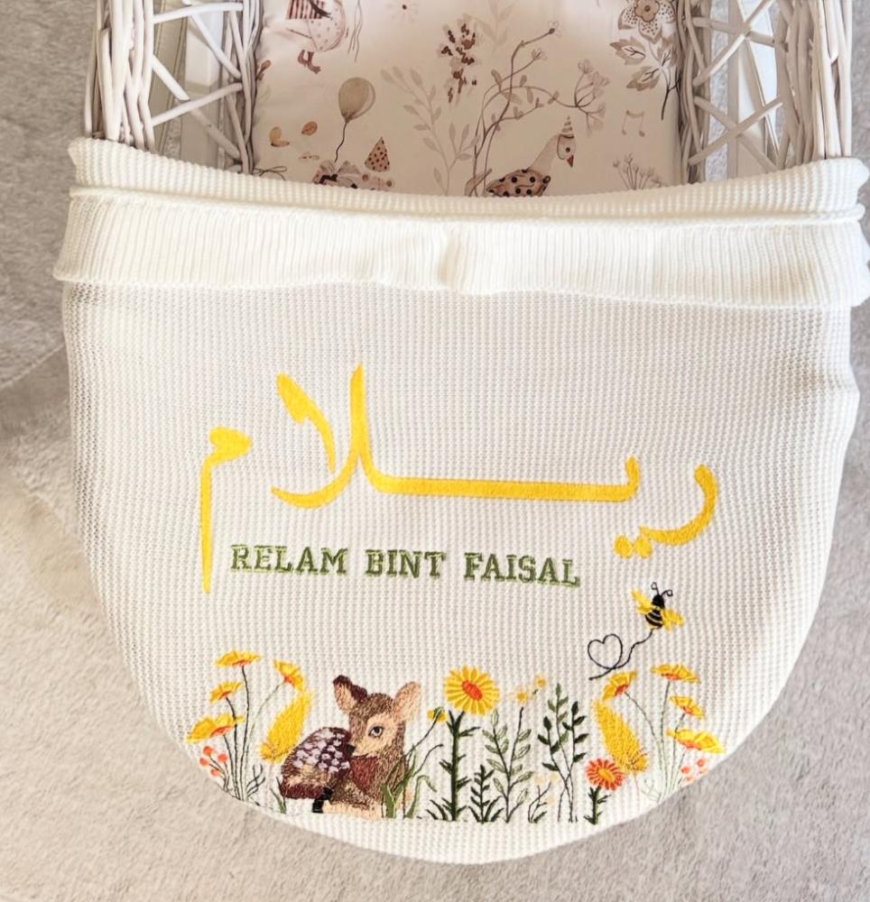 حسب طلبك. يمكنك اختيار الاسم أو الأحرف الأولى للطفل وسنقوم بتطريزها بأناقة على البطانية.